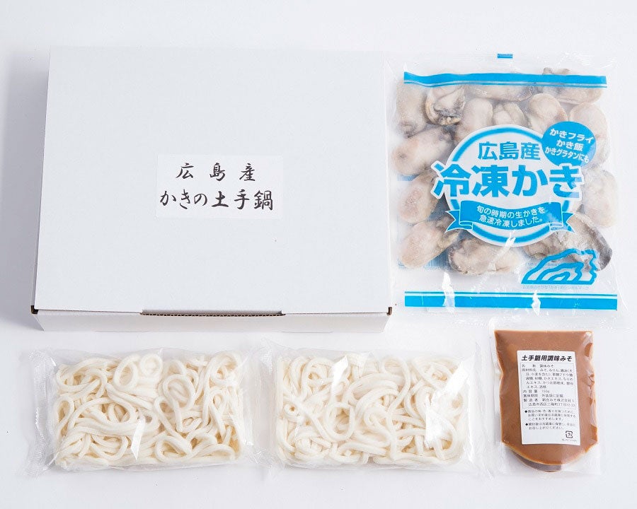広島かきはもちろん、土手鍋に必要な土手鍋用味噌と冷凍うどんがセットになっています。
