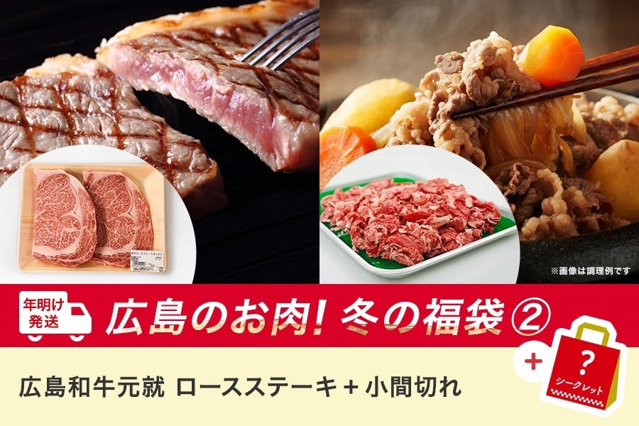 【広島血統和牛 元就】のロースステーキと和牛小間切れ、さらにシークレット商品のセットです。