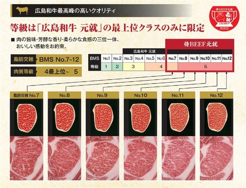 広島和牛元就のなかでも4クラス上位〜5クラスの肉質等級指定の最高級ブランド「侍BEEF元就」が登場!