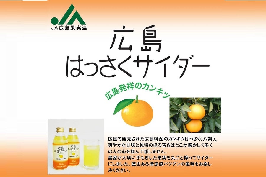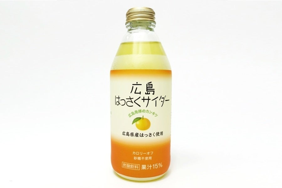 広島はっさくサイダー 広島のはっさく1/2個分の果汁を使用したはっさく果汁入り炭酸飲料です。 広島で発見された広島特産のカンキツ「はっさく」 爽やかな甘味と独特のほろ苦さはどこか懐かしく多くの人の心を掴んで離しません。 農家が大切に手もぎした果実を丸ごと絞ってサイダーにしました。 清涼感バツグンの風味をお楽しみください。 油っぽい料理と一緒に飲むとすっきりさせてくれます。スポーツ後や風呂上がりなどにもオススメです。 焼酎などのアルコールと割っても美味しくいただけます。 <名 称>15%はっさく果汁入り飲料(炭酸ガス入り) <内容量>250ml <原材料名>はっさく/炭酸、香料、酸味料、ビタミンC、甘味料(アセスルファムK、スクラロース) <保存方法>高温多湿・直射日光を避け、冷暗所で保存してください。 <賞味期限>製造日より10ヵ月
