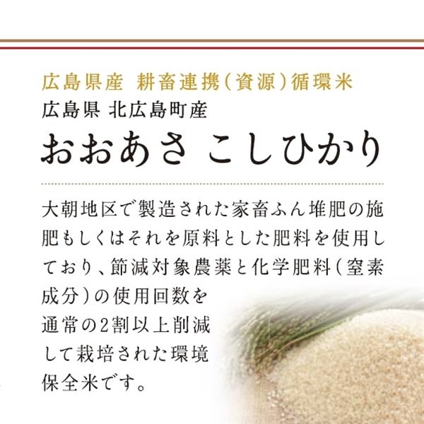 「おおあさこしひかり」は北広島町大朝地区で製造された家畜ふん堆肥の施肥もしくはそれを原料とした肥料を使用しており、節減対象農薬と化学肥料(窒素成分)の使用回数を通常の2割以上削減して栽培された「環境保全米」です。