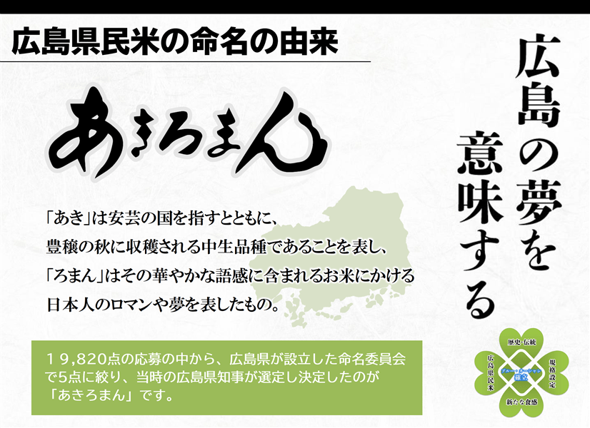 「あき」は安芸の国を指すとともに、豊穣の秋に収穫される中正品種であること表し、「ろまん」はその華やかな五感に含まれるお米にかける日本人のロマンや夢を表しています。