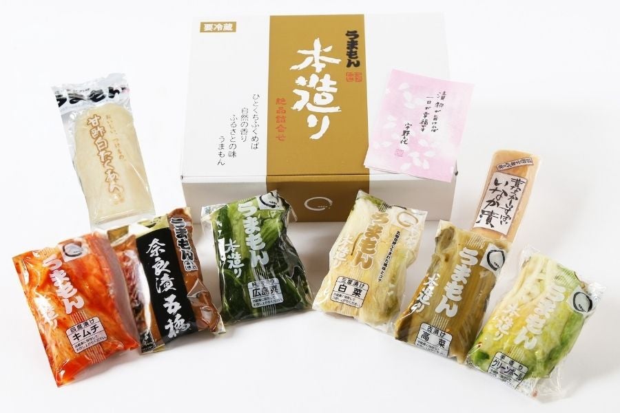 爽やかな風味の「甘酢白たくあん」、銘酒「五橋」の酒粕で熟成させた奈良漬の詰合せです。
