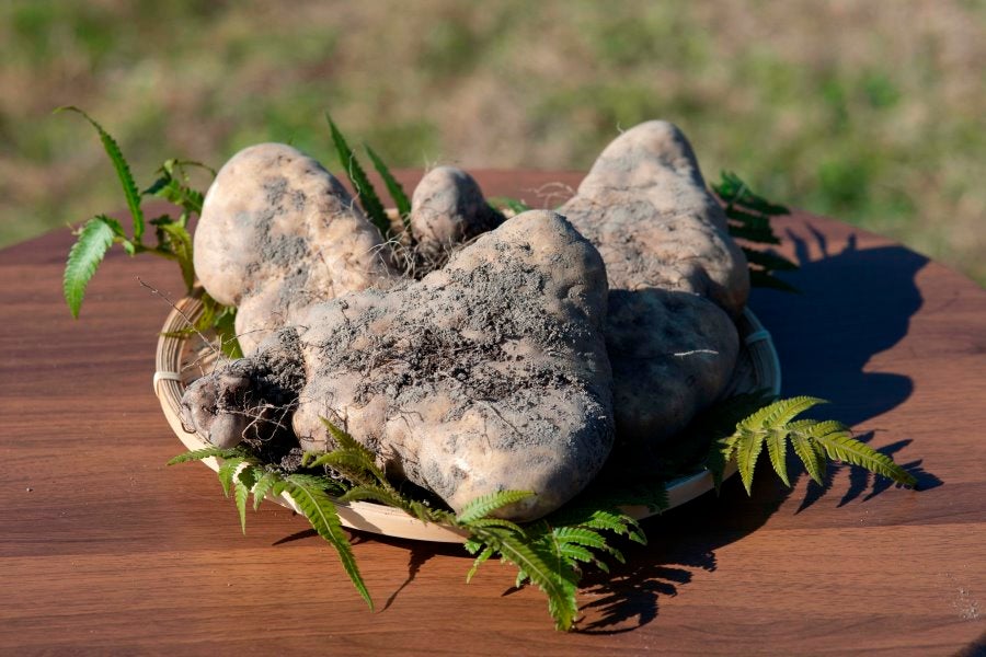 地理的表示保護制度(GI)に登録された「徳地(とくぢ)やまのいも」は、山口県の伝統野菜です。拳のような形で、粘りが強く、消化もよいスタミナ食として重宝されています。
