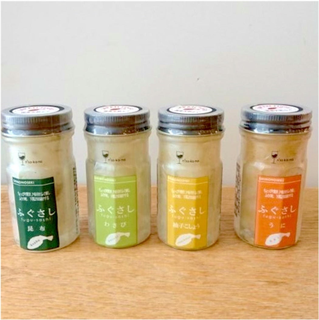 ・国産マフグのふぐさし(1本/50g)4種(柚子こしょう・昆布・うに・わさび)×各1本