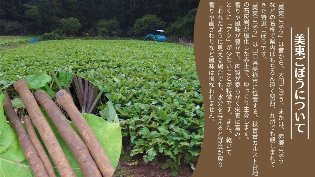 「ねばっこい土壌で育った美東ごぼうは、やわくて、風味がでてウマいよ〜」と農家さんも自信をもってオススメします!
