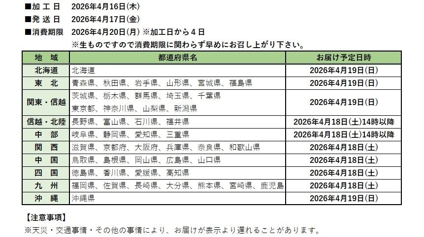 なお、消費期限は、加工日から4日となっており、4月20日(月)となりますので、お早めにお召し上がり下さい。