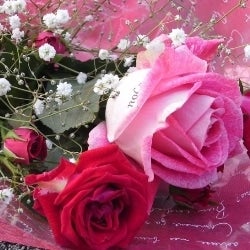 バラ:メッセージ入り大輪1本(ピンク系)、スプレー2本(赤系)