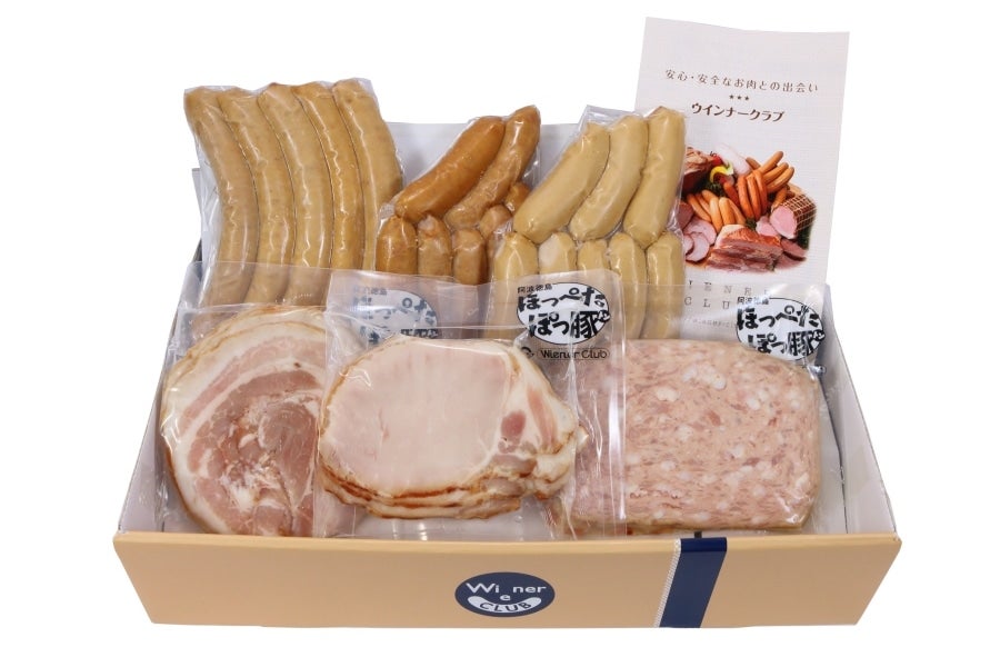 徳島県のブランド豚「阿波美豚(あわびとん)」使用した、無塩せきソーセージ4種類とスライスハム2種類のセットです。