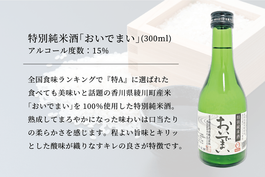 綾菊酒造は、寛政2年(1790年)に創業、「綾菊」「国重」などの銘柄を有する香川県の地酒メーカーです。 その綾菊酒造がおすすめする飲み切りサイズ(300ml)の日本酒とリキュールを3本と香川県の郷土食品である しょうゆ豆3袋をセットにしました。しょうゆ豆は香川県の創業50年を超える老舗の黒川加工食品さんの製品です。