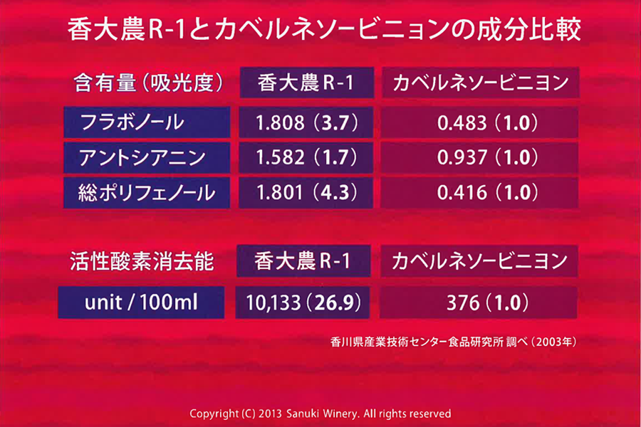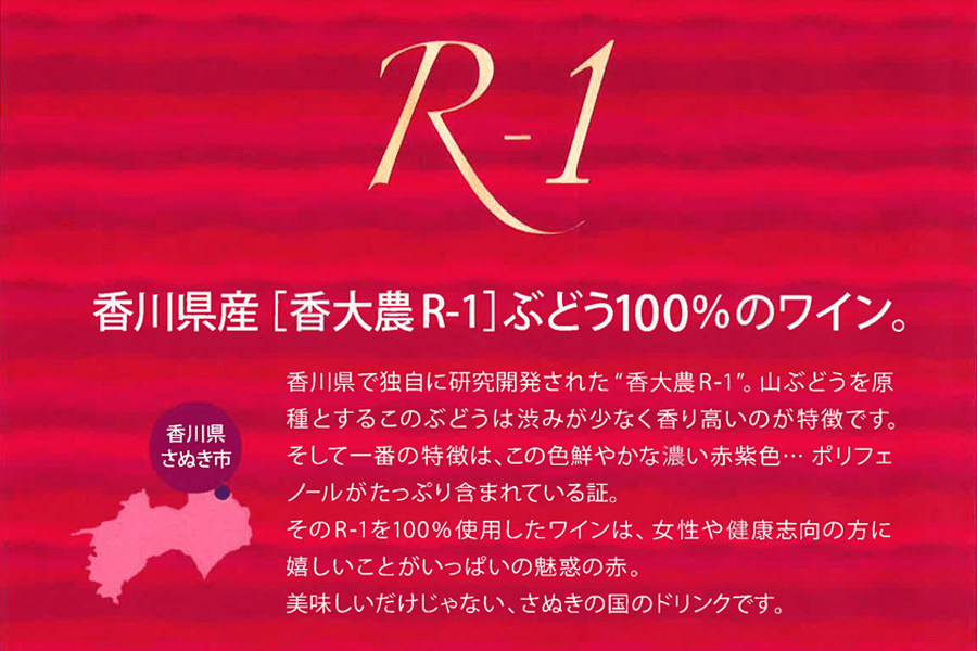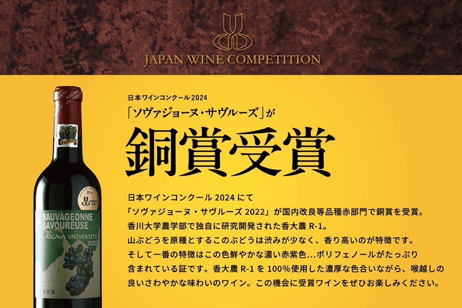 2022年醸造のソヴァジョーヌ・サヴルーズが、日本ワインコンクール2024で銅賞を受賞しました! 香川大学農学部が独自開発したオリジナルぶどう品種「香大農R−1」(かだいのうアールいち)100%で醸造した、オンリーワンの商品です。 ポリフェノールの含有量が多く、アントシアニンも豊富でとても濃い色をしておりますが、渋みは少なく軽やかな飲み口のワインです。
