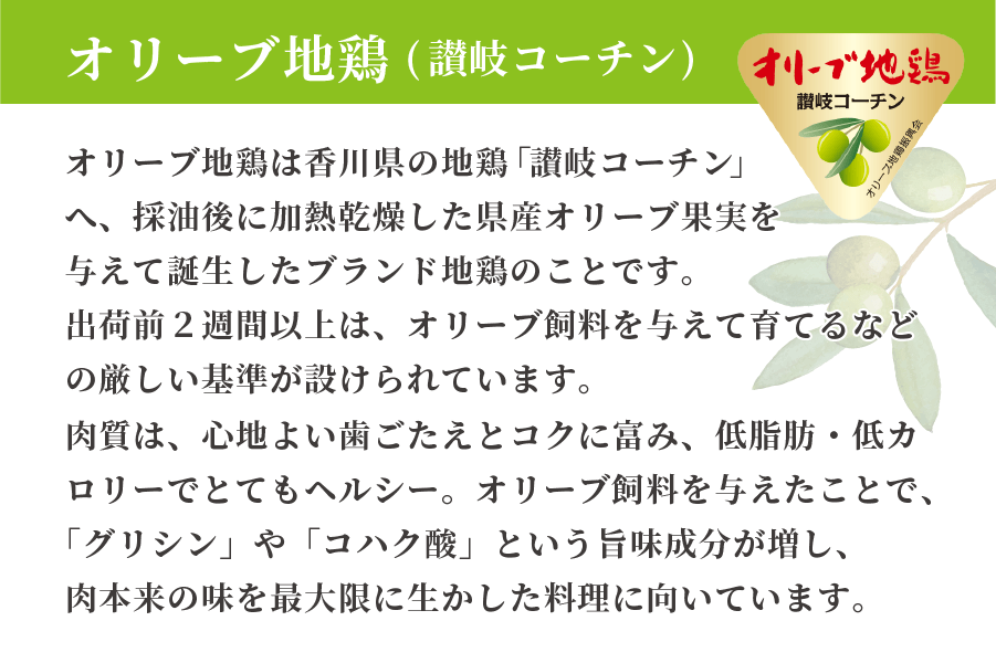 骨付鳥は香川県丸亀市発祥のご当地グルメです。 この人気の讃岐名物をブランド地鶏であるオリーブ地鶏を使って焼き上げました。 オリーブ地鶏の魅力を十分に引き出した骨付鳥は、ビールとの相性も抜群ですし、 おかずとしてご家族でもお楽しみいただけます。