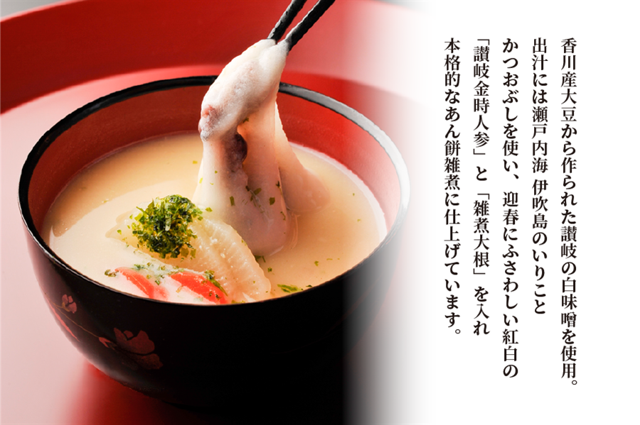 香川県のお正月に欠かせないのは、白味噌仕立ての味噌汁にあん餅を入れた「あん餅雑煮」。 「餅」は甘さ控えめの丹波大納言小豆をブレンドした「粒あん餅」。味噌には「米」は新米の 香川県産コシヒカリ、「大豆」は香川県産フクユタカ、「食塩」は瀬戸内海の海水をじっくりと 煮詰めたミネラルたっぷりの瀬戸のあらじおを使用。「出汁」には瀬戸内海 伊吹島のいりこと かつおぶしを使い、迎春にふさわしい紅白の「讃岐金時人参」と「雑煮大根」を入れ、本格的な あん餅雑煮に仕上げております。