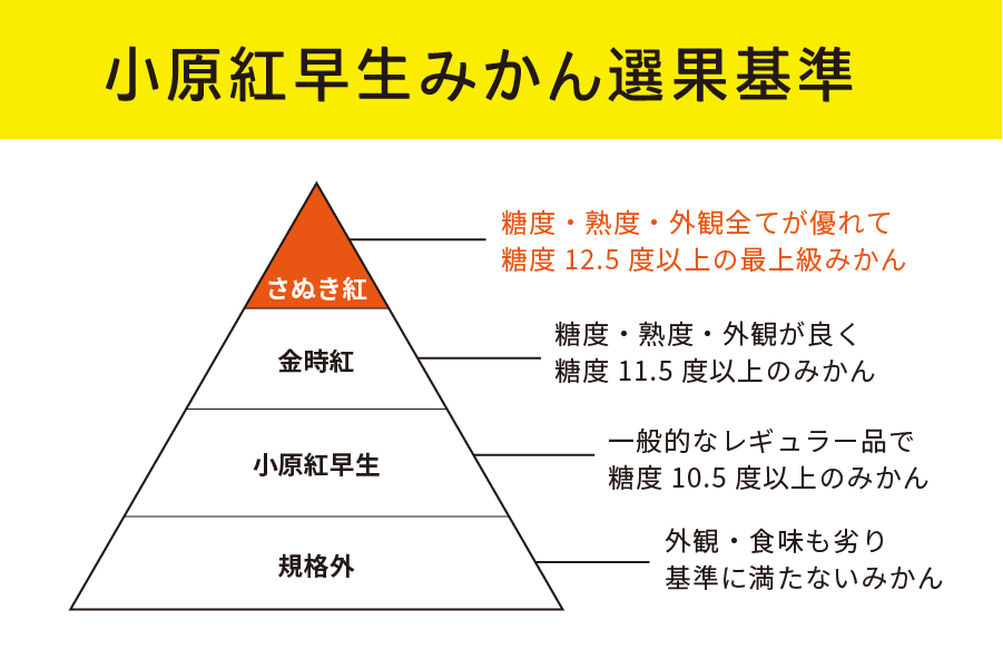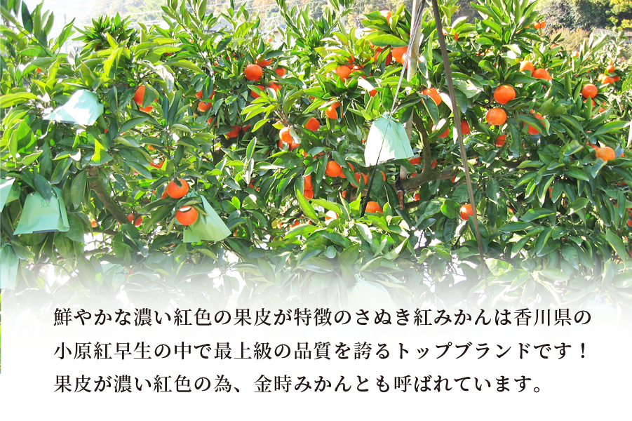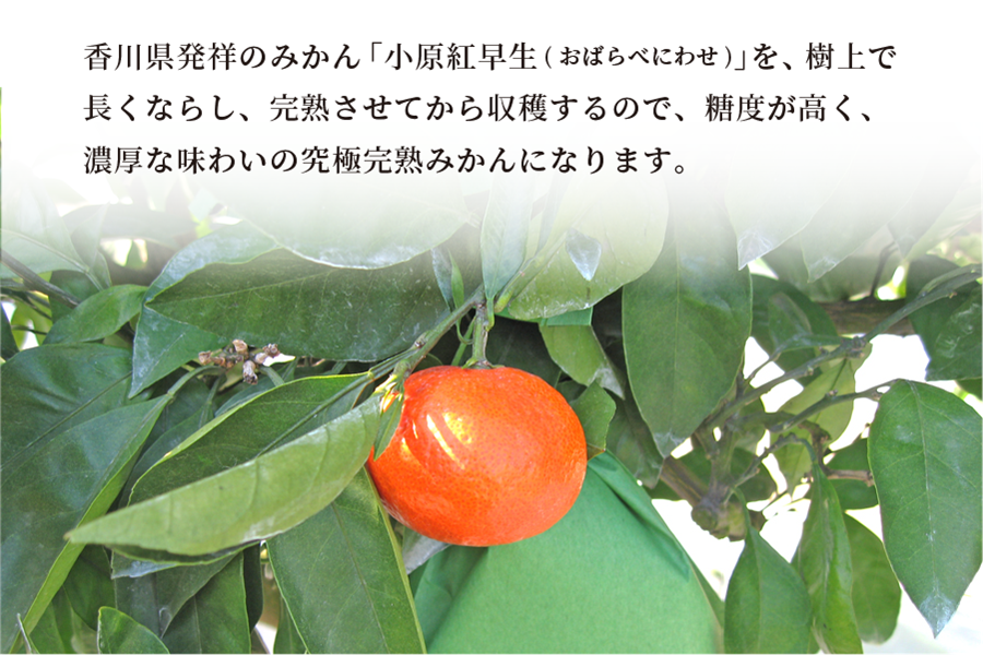 昭和48年に香川県坂出市の小原さんのみかん園で果皮が濃い紅色をしたみかんが発見されました。 このみかんは「小原紅早生」と命名され、香川県農業試験場府中果樹研究所などで調査を行い、 平成5年10月に品種登録された香川県のオリジナル品種です。 本来の収穫時期より2ヶ月あまり遅い年明けまで樹上で越冬させ、完熟にしてから収穫します。 丹精込めて育てられた大変希少なみかんです。