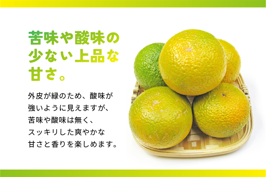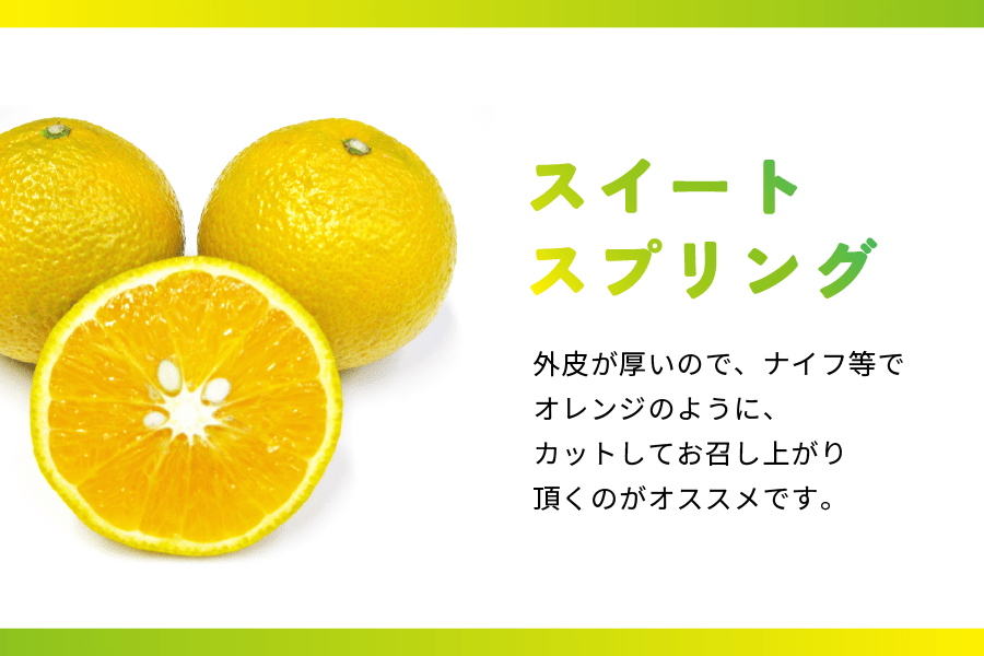 スイートスプリングは、温州みかんと八朔の交配種で、 酸味が少なく爽やかな甘さが特徴です。外皮が厚く剥きにくいので、 オレンジなどのように横に切り込みを入れてから、くし形にカットして、 内皮ごと食べるのが、おすすめです。