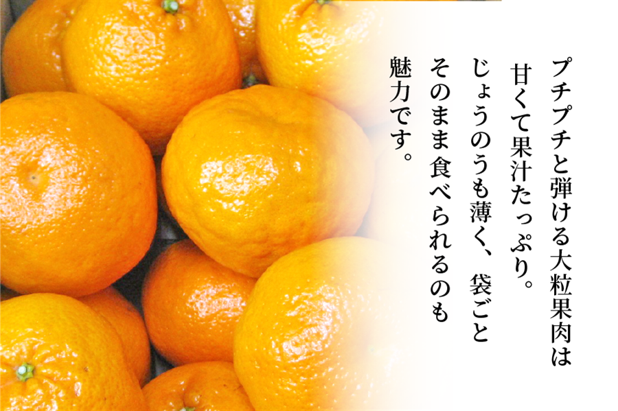 はるみみかんは「清見オレンジ」と「ポンカン」の交配によって生まれた中晩柑橘です。 「デコポン」の妹分のような柑橘で、プチプチ弾ける大粒果肉はジューシーでしっかりとしています。 濃厚な味わいの「デコポン」に比べるとマイルドな味わいでさっぱりしています。