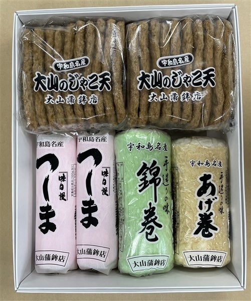 愛媛県宇和島市・大山蒲鉾店の "手作りの逸品” ! 創業昭和33年の大山蒲鉾店が、宇和海でとれた小魚を主原料として、 伝統の技術と最新の衛生的な設備を加え、素材の味を活かした 旨さとコクのある手作りの逸品に仕上げています。 つなぎの澱粉は使用していません。 <セット内容> 〇じゃこ天20枚  〇あげ巻 1本 〇かまぼこ(つしま)2本  〇錦巻(青)1本 <製造>大山蒲鉾店:愛媛県宇和島市 JAえひめ南特産品センター「みなみくん」よりクール冷蔵便でお届けします。 <じゃこ天いろいろ> ※じゃこ天とは、ねり製品の一種です。宇和海でとれる新鮮な小魚を骨ごと、皮付きのまますり身にして油で揚げたものです。一般的な「天ぷら」のように衣をつけて揚げるのではなく、小魚のすり身を平べったい小判型に成型し、そのまま揚げます。小魚の旨みが凝縮され、豊かな風味が自慢です。 ※じゃこ天は宇和島の特産品のひとつで、その歴史は古く、元和元年(1615)、宇和島藩初代藩主・伊達秀宗が仙台から職人を連れてきて蒲鉾を作らせたのが始まりだといわれています。昔から宇和島では魚が豊富に獲れていたので、江戸時代にはすでにねり製品は商品化されていたといいます。 *〇名称:じゃこ天 20枚  〇内容量 :40g  〇原材料 :魚肉、食塩、ブドウ糖、食用菜種油/調味料(アミノ酸等)、保存料(ソルビン酸)、甘味料(ステビア、カンゾウ)  〇賞味期限:製造後6日  〇保存方法:要冷蔵(1℃〜10℃)  〇製造者:大山蒲鉾店(愛媛県宇和島市)  〇原料原産地(魚肉):日本、タイ *〇名称:あげ巻 1本  〇内容量 :約200g  〇原材料 :魚肉、油揚げ(大豆を含む)(遺伝子組換え)、食塩、卵白(卵を含む)/調味料(アミノ酸等)、保存料(ソルビン酸)、リン酸塩(Na)、甘味料(ステビア、カンゾウ抽出物)  〇賞味期限:製造後11日  〇保存方法:要冷蔵(1℃〜10℃)  〇製造者:大山蒲鉾店(愛媛県宇和島市)  〇原料原産地(魚肉):日本、タイ *〇名称:蒲鉾(つしま) 2本  〇内容量 :100g   〇原材料 :魚肉、食塩、卵白(卵を含む)/調味料(アミノ酸等)、保存料(ソルビン酸)、リン酸塩(Na)、甘味料(ステビア、カンゾウ抽出物)、着色料(赤106、カロチン)  〇賞味期限:製造後11日  〇保存方法:要冷蔵(1℃〜10℃)   〇製造者:大山蒲鉾店(愛媛県宇和島市)  〇原料原産地(魚肉):日本、タイ *〇名称:錦巻 青1本  〇内容量 :300g  〇原材料 :魚肉、食塩、卵白(卵を含む)/調味料(アミノ酸等)、・保存料(ソルビン酸)、リン酸塩(Na)、甘味料(ステビア、カンゾウ抽出物)、着色料(青1、黄4)  〇賞味期限:製造後11日   〇保存方法:要冷蔵(1℃〜10℃)    〇製造者:大山蒲鉾店(愛媛県宇和島市)  〇原料原産地(魚肉):日本、タイ 【ご注文前にご確認ください】 ※お届け日(曜日含む)のご指定や他商品との同時配送はできません。 ※発送日や着日の事前連絡はできません。 ※クール冷蔵便でのお届けとなります。  送料に加えて、クール代が別途かかります。 ※のし対応、包装について  通常の包装をしてその上にのしを貼り、その上に茶色のあて紙をして、送り状を貼りクール便で発送いたします。 *代引きでのご注文はできません。 *配達時の事前連絡のご希望や宅配ボックス使用の可否など、運送業者へのご要望につきましてはヤマト運輸へご連絡下さいますようお願いいたします。 あらかじめご了承ください。