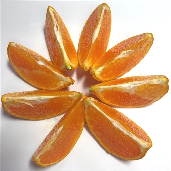 品種名は「愛媛果試第48号」で「愛媛果試第28号」と「甘平」の交配品種。薄くてやわらかい外皮とじょうのう膜(薄皮)を持ち、果肉はとろけるようなゼリーの食感です。