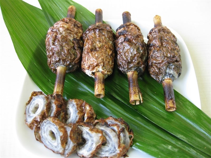 竹に1枚1枚丁寧に手作業にて巻きつけ焼いて仕上げました。