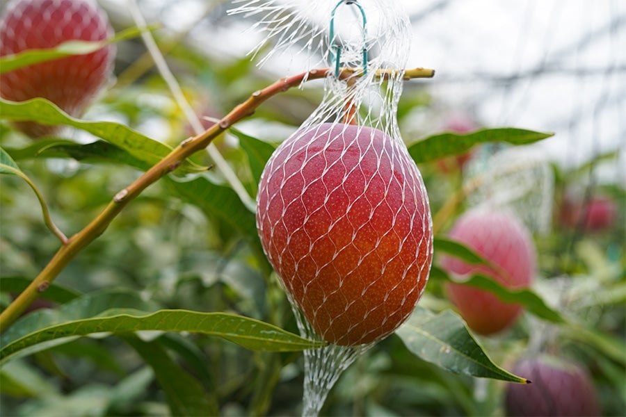 さらに、甘くて大きなマンゴーを育てるため、無数に結実するマンゴーの実を最終的には1枝に1玉まで間引くことで養分を集中させます。太陽の光を浴びてあざやかな赤色になるように、1玉ずつ紐で吊り上げて栽培し、熟れて自然落下した完熟マンゴーをネットで優しくキャッチして収穫。