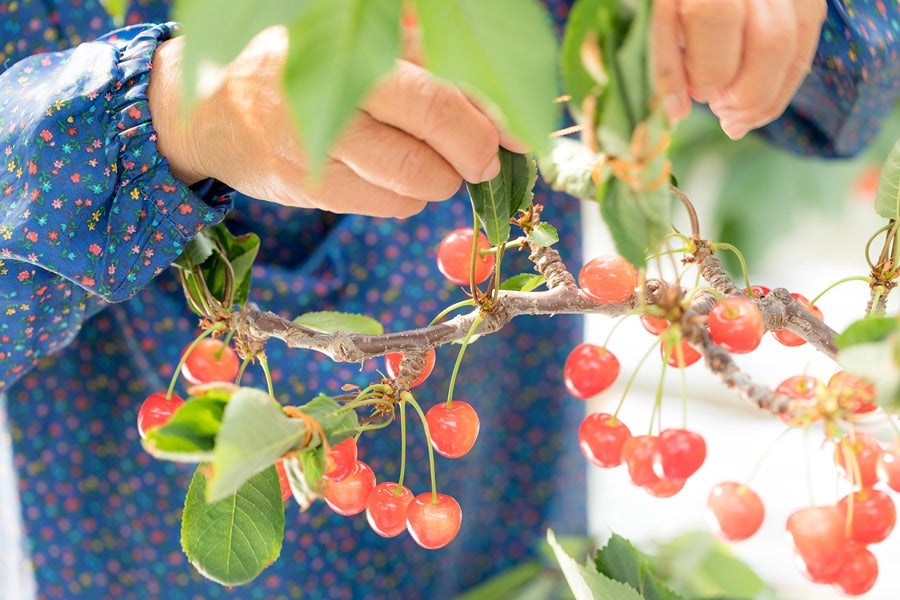 鮮やかな紅色の果皮、糖度など「さくらんぼのお王様」と言われる佐藤錦を南国高知で栽培しています。