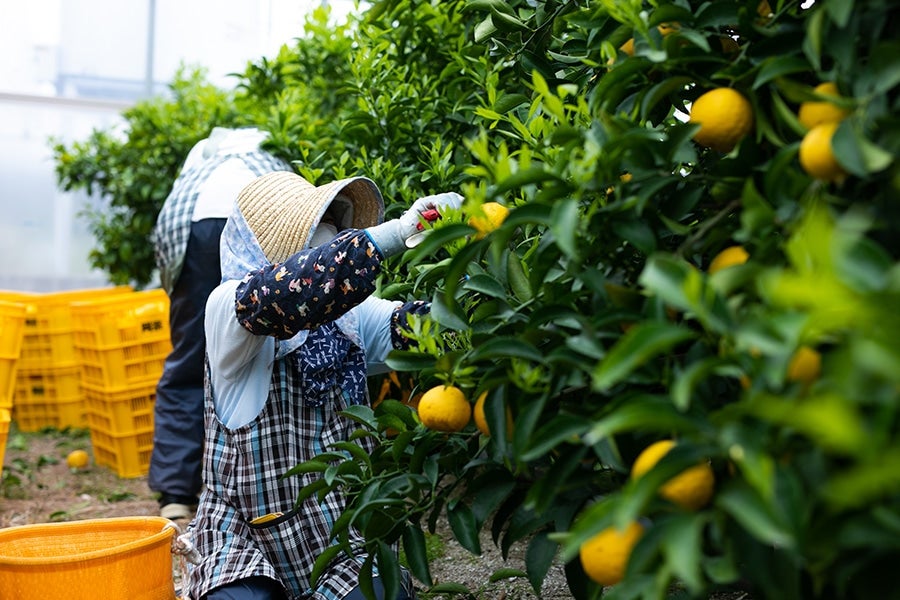 ハウス小夏の特徴は、ハウス栽培ならではの口当たりと、出荷時期に合わせた甘みと酸味のバランスです。露地に比べて風にさらされる事が少ないので、小夏の実がふわっと大きくなりやすく、甘皮や果肉がやわらかくなりやすいです。水や肥料の管理によって糖度を上げる工夫をしています。