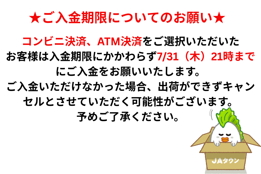 ※コンビニ決済、ATM決済をご選択いただいたお客様は入金期限にかかわらず7/31(木)21時までにご入金をお願いいたします。