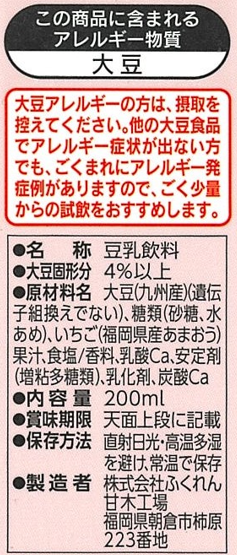 九州産大豆に福岡県産『博多あまおう』原料にこだわった飲みやすい♪♪豆乳飲料♪♪ ・九州産大豆で作った安心な豆乳に ・ 福岡県ブランド『博多あまおう』を使用。 ・ 博多あまおうの甘さをブレンドしたのみやすい豆乳飲料です。 ・ こだわりの原料で、安全・安心・おいしさをお届けします。 【名 称】 ふくれん 豆乳飲料 博多あまおう 【原材料名】 大豆(遺伝子組換えでない)、糖類(砂糖、水あめ)、いちご(福岡県産博多あまおう)果汁、食塩、香料、乳酸Ca、安定剤(増粘多糖類)、乳化剤、炭酸Ca 【内 容 量】 200ml×24本【2箱セット】 【賞味期限】 180日(製造日を含む) 【保存方法】 直射日光・高温多湿を避け、常温で保存。 【注意事項】 ・開封後は賞味期限にかかわらず、すぐにお飲みください。 ・凍らせないでください。内容液が膨張し容器が破損します。 ・大豆の成分が沈殿または脂肪分が表面に浮くことがありますが、品質には問題ありません。 ・よく振ってお飲みください。 ・冷やすとよりおいしくお飲みいただけます。