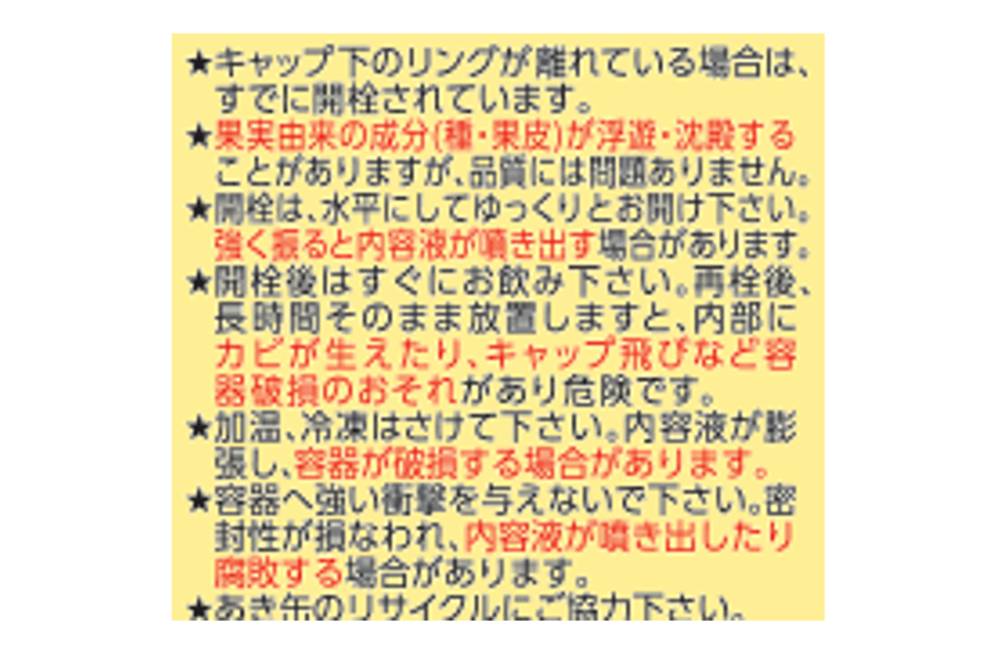 ・果実由来の成分(種・果皮)が浮遊・沈殿することがありますが、品質には問題ありません。