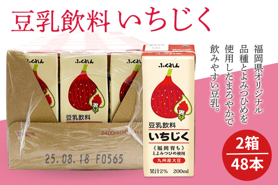 九州産大豆に福岡県産『とよみつひめ』 原料にこだわった飲みやすい♪♪豆乳飲料♪♪ ・九州産大豆で作った安心な豆乳に ・『糖度が高く甘みが強い』『果汁豊かでやわらかい食感』の ・とよみつひめ果汁をブレンドした豆乳飲料です。 ・ こだわりの原料で、安全・安心・おいしさをお届けします。 【名 称】 ふくれん 豆乳飲料 いちじく 【原材料名】 大豆(遺伝子組換えでない)、糖類(砂糖、水あめ)、いちじく果汁、 食塩、香料、乳酸Ca、安定剤(増粘多糖類)、乳化剤 【内 容 量】 200ml×24本【2箱セット】 【賞味期限】 製造日より180日 【保存方法】 直射日光・高温多湿を避け、常温で保存。 【注意事項】 ・開封後は賞味期限にかかわらず、すぐにお飲みください。 ・凍らせないでください。内容液が膨張し容器が破損します。 ・大豆の成分が沈殿または脂肪分が表面に浮くことがありますが、品質には問題ありません。 ・よく振ってお飲みください。 ・冷やすとよりおいしくお飲みいただけます。