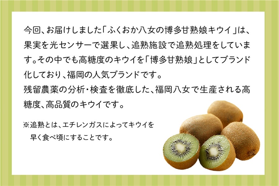 今の時期は、博多あまおう・華たちばなみかん・甘熟娘キウイの3種をセットにしてお届けします。