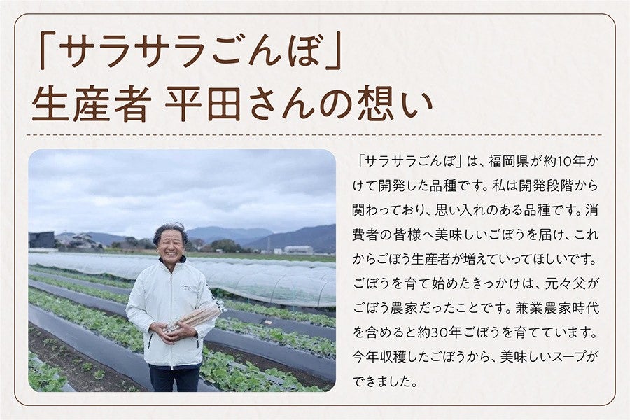 福岡県オリジナル品種のごぼう「サラサラごんぼ」の豊かな風味と香りがつまったやさしい味わいのポタージュです。