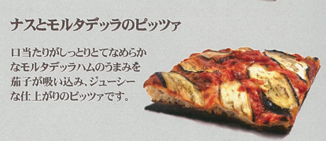 口当たりがしっとりとてなめらかなモルタデッラハムのうまみを茄子が吸い込み、ジューシーな仕上がりのピッツァです。
