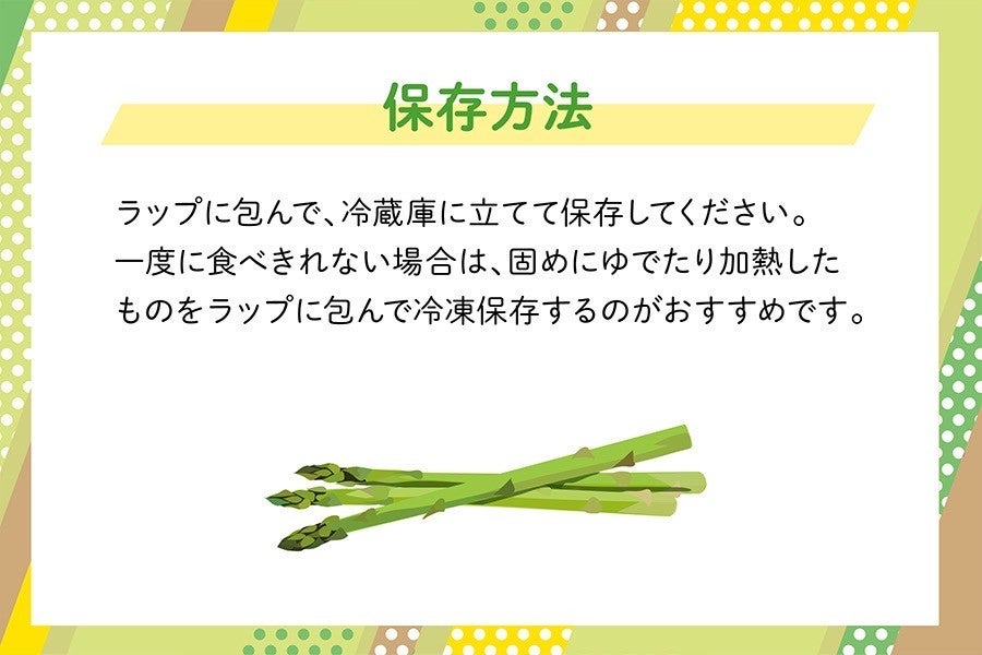 旨味とコクのある味と歯ごたえが特徴のアスパラガスは、多年草で、地下茎で越冬しますが、春先に地面をおしのけて出てくる芽(若茎)が食べる部分です。春(3〜4月)と夏(6〜7月)にピークを迎えます。春芽は濃い緑色で甘味が強く、根元まで柔らかい、夏芽は鮮やかなグリーンで、シャキシャキとした食感が特長です。茹でたり、焼いたり、シンプルな料理で食べるのがおすすめのアスパラガスですが、火の通りが良いので、炒め物や天ぷらでもおいしくいただけます。