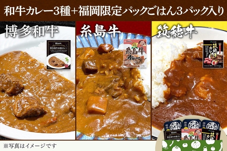 福岡の和牛、糸島牛カレー、筑穂牛カレー、博多和牛本格カレーの3種を贅沢に食べ比べしてみてはいかがでしょうか。本格的な味をお手軽にご家庭でお楽しみください。