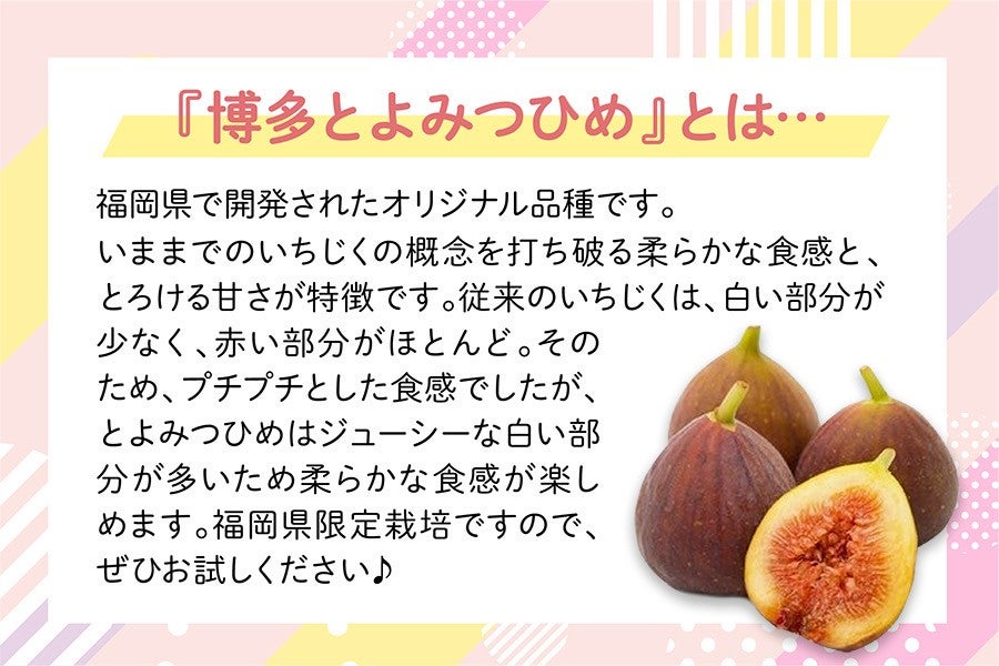 福岡県が長い歳月をかけ開発した、福岡県オリジナル品種です。高い糖度ととろりとした食感が特徴です。従来のイチジク品種にない甘さ、ジューシーな食感が特徴です♪