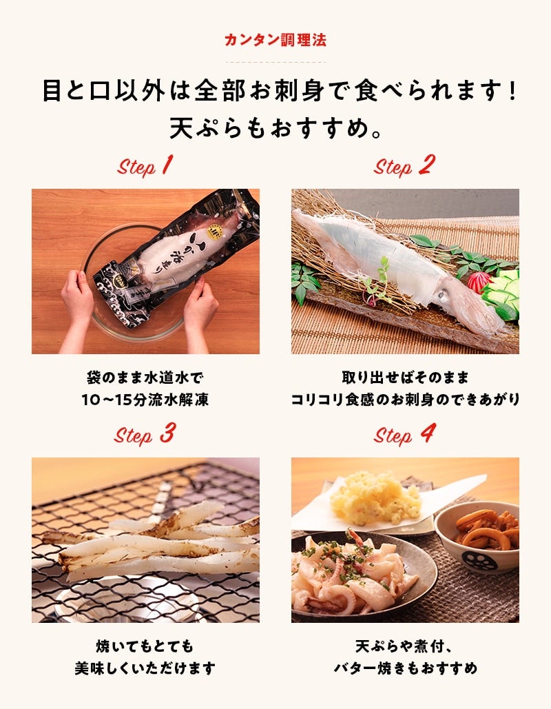 【期間限定】旬の剣先イカを水揚げしてすぐに活き造りにし、獲れたての鮮度と旨味そのままにCAS凍結してご家庭の食卓にお届けします。