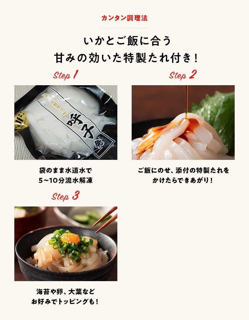 イカをごはんにのせ、特製タレをかけてお召し上がりください。