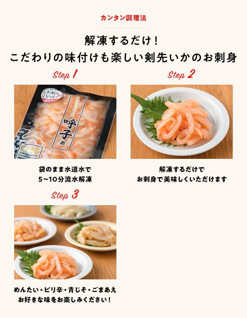 獲れたての鮮度と旨味そのままに四つの味を楽しめる、新鮮な剣先いかの身を厳選して使用したお刺身です。