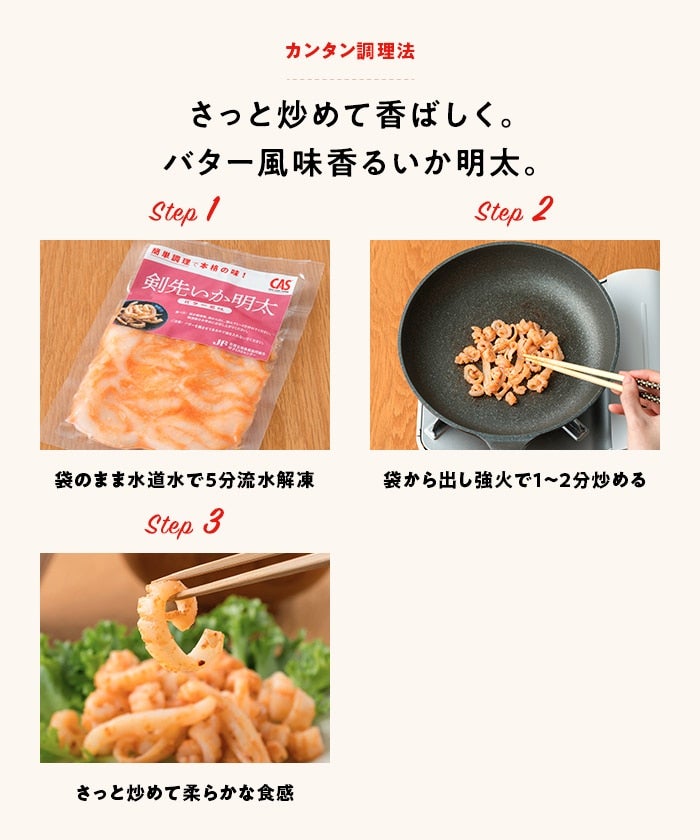 剣先いか明太 バター風味は、呼子名産の剣先いかと博多明太子を使った本格的ないか明太です。バターと絡ませてありますので、解凍後に油を入れず強火でさっと炒めるだけで、豊かなバターの風味と剣先いかの食感をお楽しみいただけます。ご飯のおともに最適です。