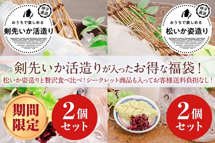 【冬の福袋・送料無料】期間限定の剣先いか活造り2点と松いか姿造り2点の贅沢食べ比べ+剣先いかのオイル漬け(レモン風味)+シークレット商品!(10,000円)