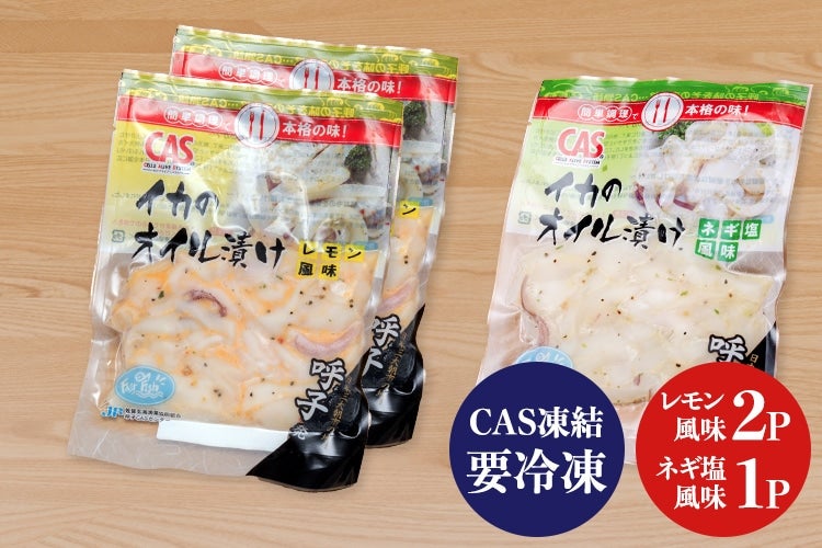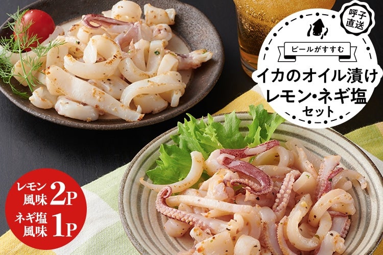 名称:呼子剣先いかのオイル漬け(レモン風味×2、ネギ塩風味×1)