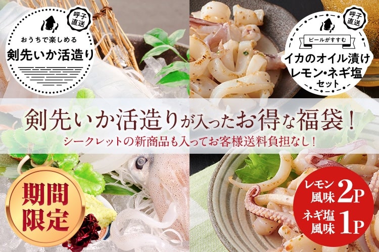 【冬の福袋・送料無料】期間限定の剣先いか活造りと剣先いかのオイル漬け3点(レモン風味×2、ネギ塩風味×1)+シークレット商品!(3,000円)