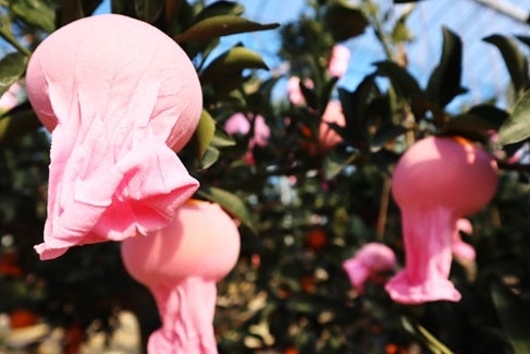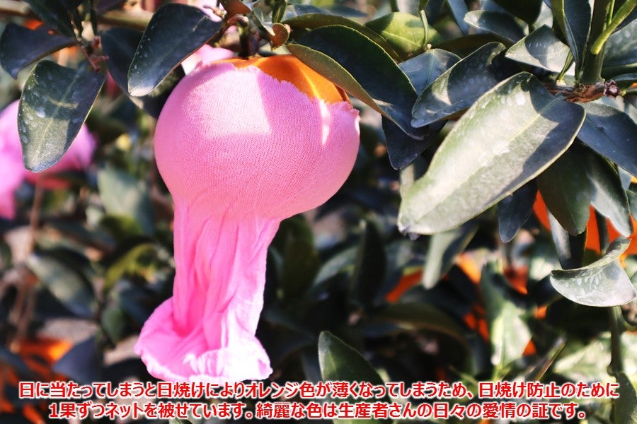 濃いオレンジ色を出すためには、日焼けをしてはいけないため、生産者のみなさんはせとか1果ずつ、丁寧にネットを被せます。