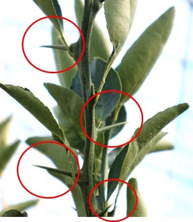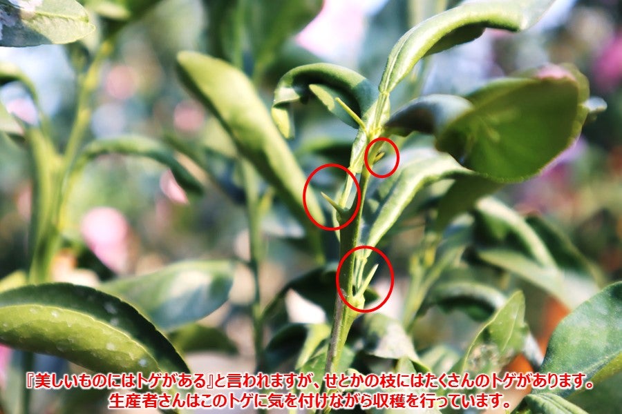 柑橘の大トロとも言われ、見た目にも気品のあるせとかの枝には、たくさんの大きな鋭いトゲがあります。