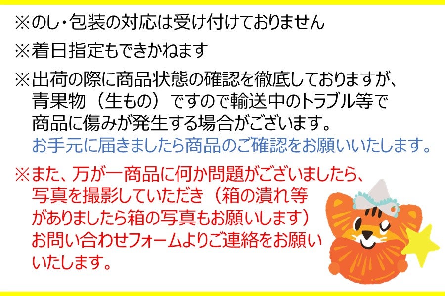 ※出荷前にすべて商品の状態は確認して出荷を徹底しておりますが、青果物(生もの)ですので、輸送中のトラブル等も発生する場合がございます。