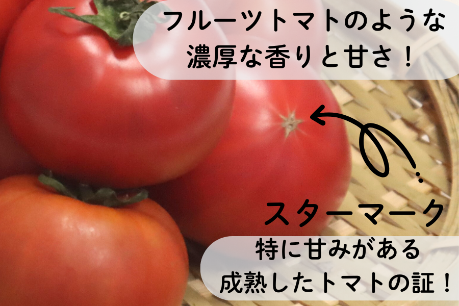 トマトのおしりの部分には甘さを表すくっきりとした「スターマーク」がはっきりと!(※放射線状の線)