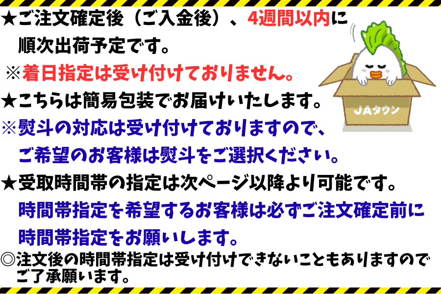 ★ご注文確定後(ご入金後)、4週間以内に順次出荷予定です。 ※着日指定は受け付けておりません。 ★こちらは、簡易包装でお届けいたします。 ※熨斗の対応は受け付けておりますので、ご希望のお客様はご注文時に熨斗をご選択ください。
