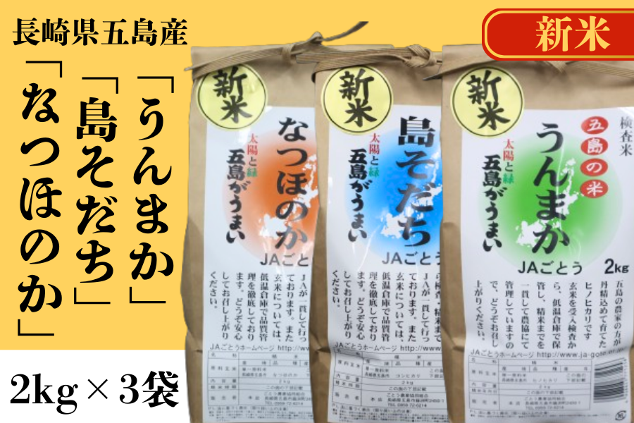 五島育ちの長崎県産米2kg×3種セット!五島の大地の恵みを存分に味わうことができます♪