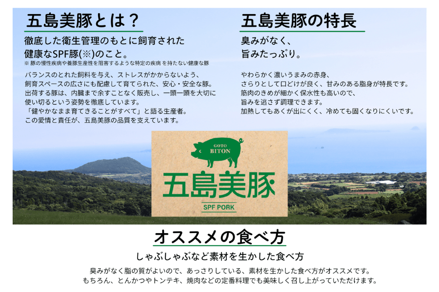 五島美豚は、五島列島で厳格な管理体制のもとで育てられたSPF豚※です。臭みが少なく、上質な脂の甘みが自慢の五島美豚は、生産者が限られているため、知る人ぞ知る大変貴重な一品です。